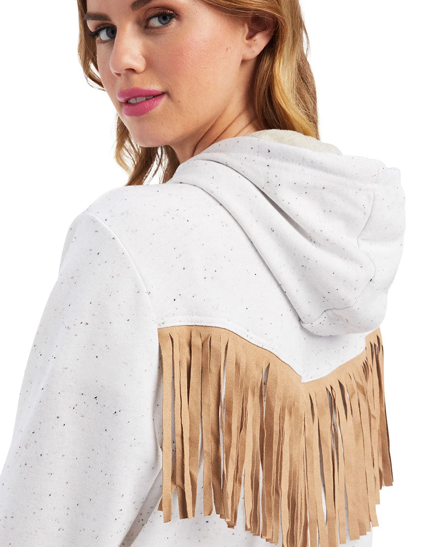 We have jeans with fringe and jackets with fringe—now we have a sweatshirt