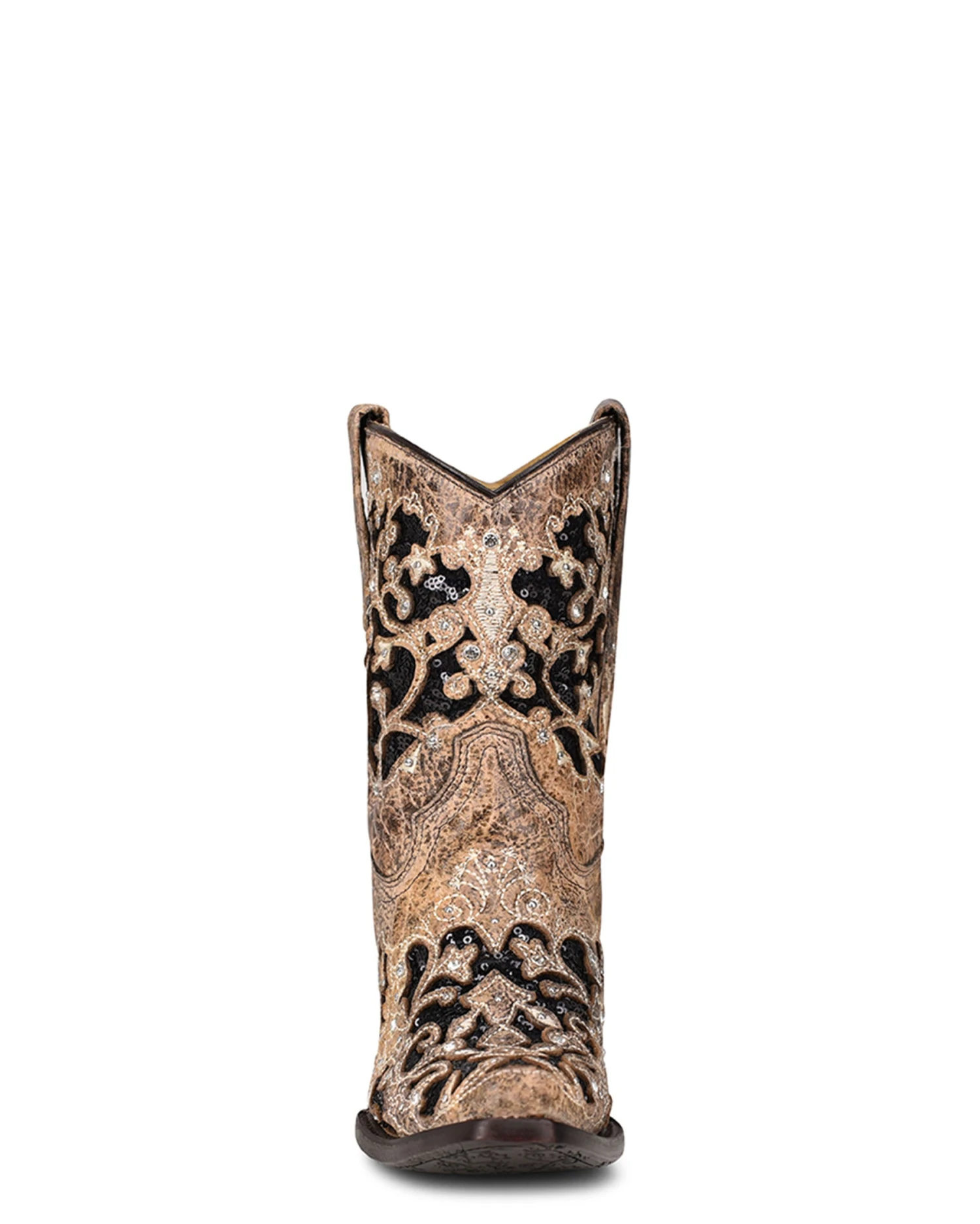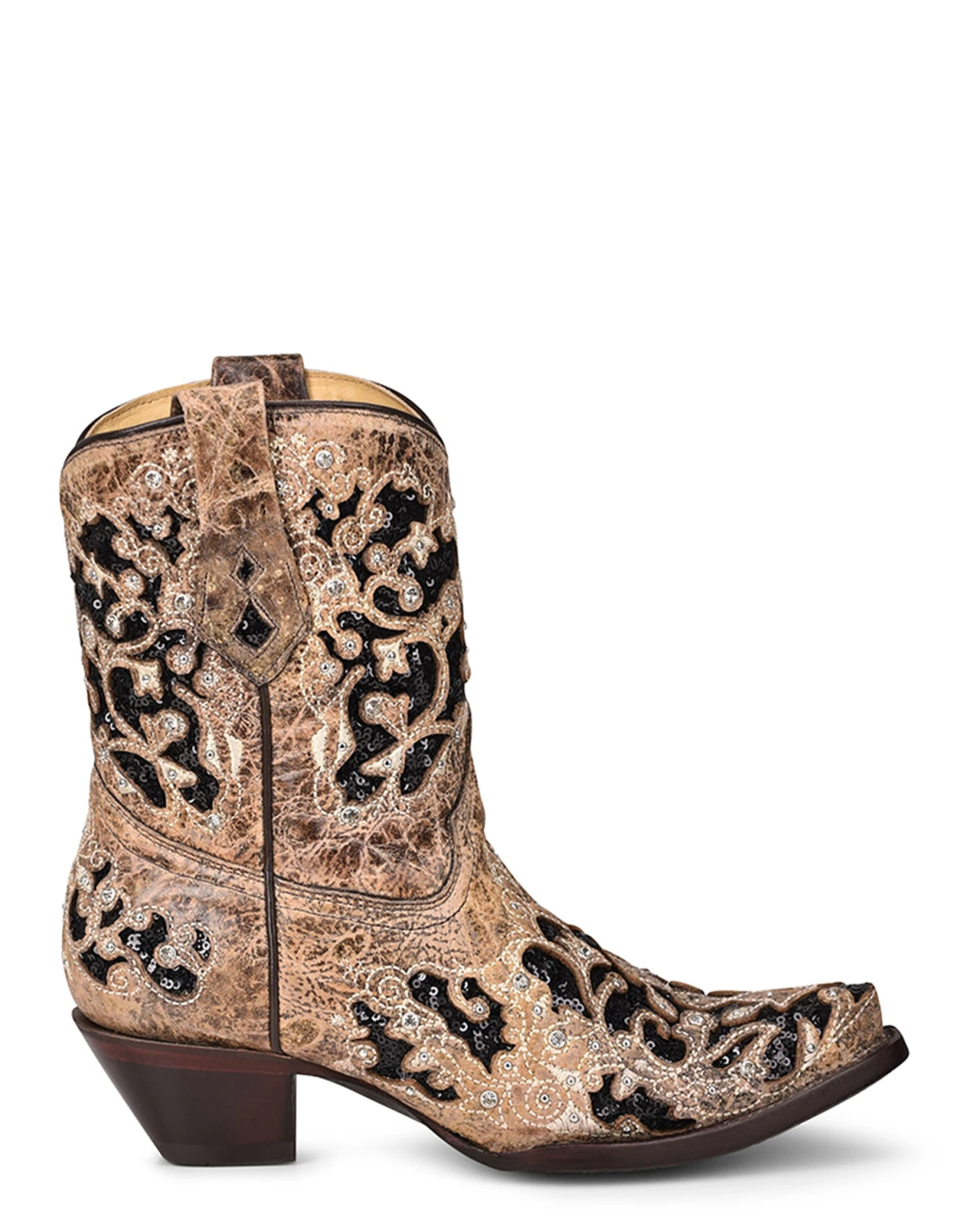 Introducing the Corral Women’s Brown Inlay Western Booties- where fabulous fashion meets unbeatable comfort! These exquisite brown boots will be your go-to footwear for every occasion, turning heads and receiving compliments wherever you step. Expertly crafted with high-quality materials, our ankle boots boast a stunning black studded and glitter inlay, designed to sparkle and shimmer as you walk. The intricate white embroidery adds an elegant touch of sophistication, setting our boots apart from the competition. The short boot design not only offers unbeatable style but also promises convenience and easy wearability. Slip these on and off with ease, allowing you to transition seamlessly from day to night, and from work to play. If you’re ready to elevate your style and enchant everyone you meet, it’s time to grab a pair of Corral Women’s Brown Inlay Western Booties. Trust us – these boots were definitely made for walking, and you deserve to do so in fierce, fashionable confidence!