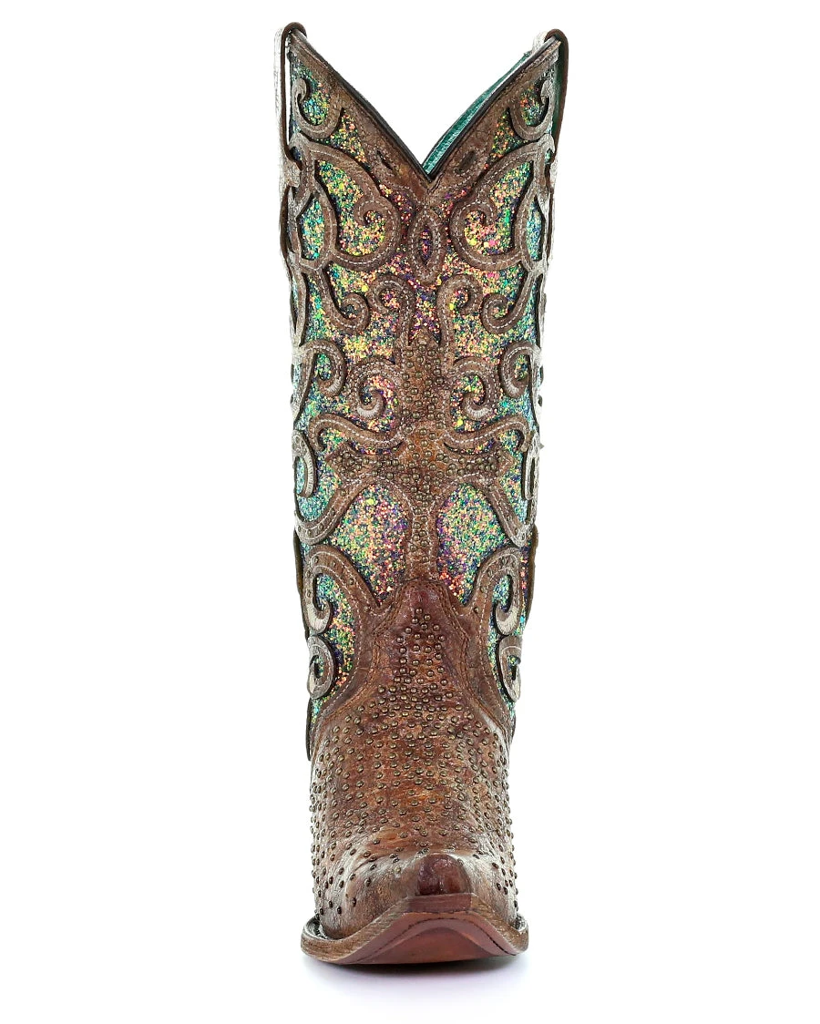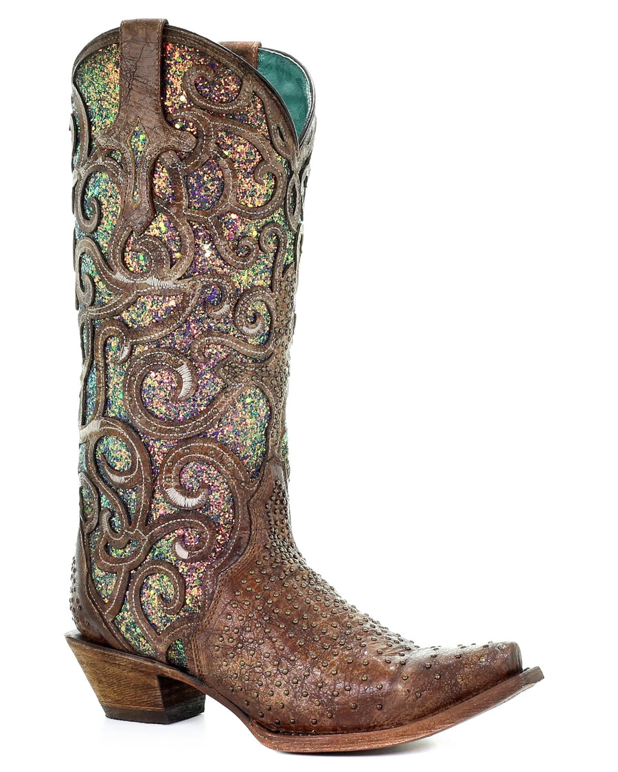Introducing the Corral Women’s Cognac Glitter Inlay Western Boots, where elegance meets the Wild West. Crafted with impeccable detail, these boots are the perfect addition to any stylish cowgirl’s wardrobe. Featuring a classic snip-toe design, these boots combine tradition with a modern twist, ensuring you stand out from the crowd. The cowboy heel adds an authentic touch and a boost in height, making these boots both fashionable and functional. Dazzle with the intricate glitter inlay that shimmers and shines, transforming every step into a glamorous statement. Adorned with embellished stud detailing, these boots showcase a unique, eye-catching style. Embrace your inner cowgirl and showcase your bold, unique personality with the Corral Women’s Cognac Glitter Inlay Western Boots. These stunning boots are the perfect combination of sophistication and rugged Western aesthetics, ready to bring a touch of glamour to your shoe collection.