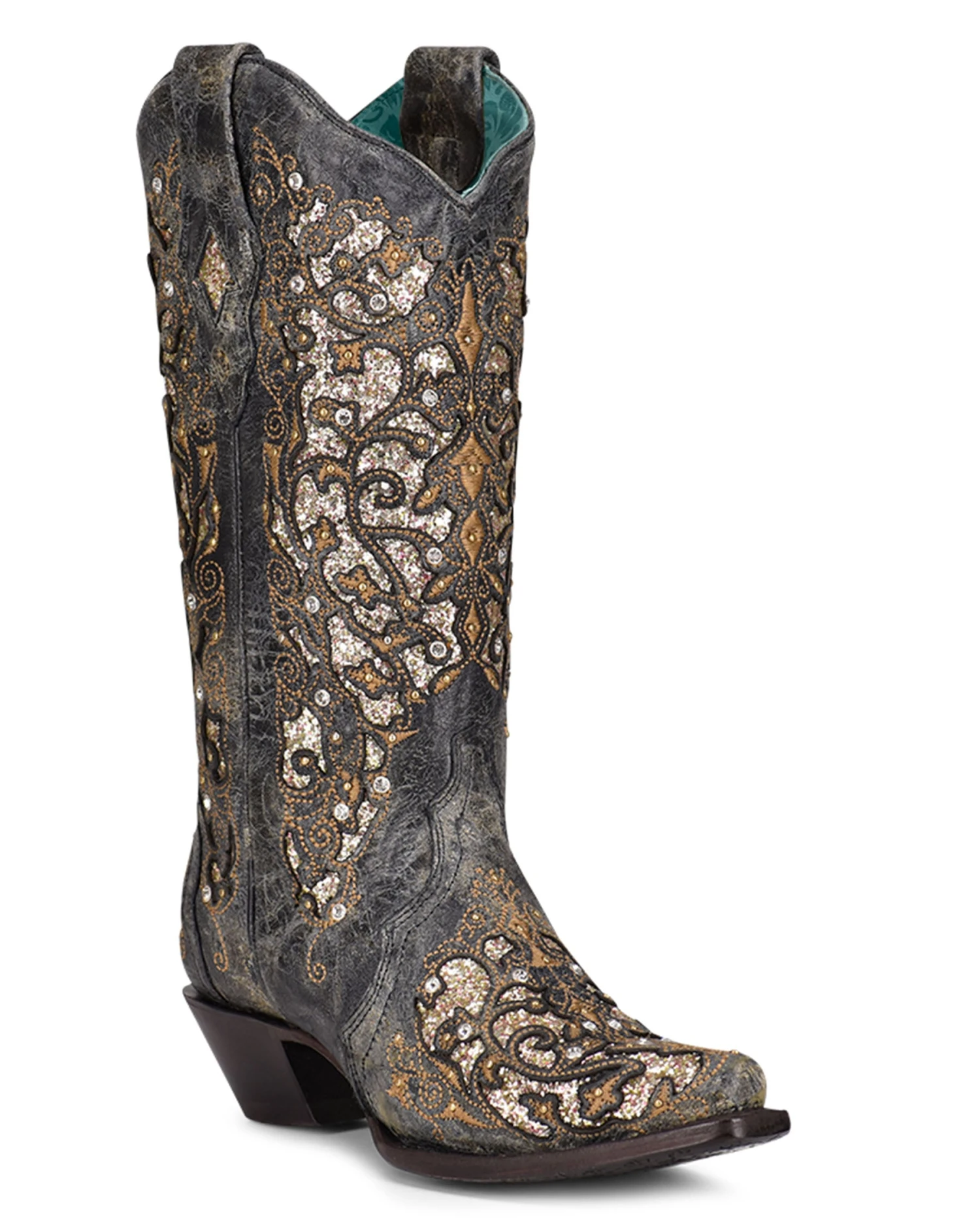 Introducing the Corral Women’s Glitter & Crystals Boots- the ultimate fusion of glamour, sophistication, and timeless Western charm. These head-turning boots are crafted to elevate your look with their stunning silver glitter finish and alluring snip-toe design. Perfect for those seeking to replace their traditional heels, these boots offer both unparalleled style and comfort. Corral Women’s Glitter & Crystals Boots feature a striking 2-inch heel that gives you the ideal height and supports your confident stride. Crafted from durable materials, these boots promise long-lasting wear that will complement your wardrobe for years to come. They boast an intricate inlay pattern that showcases the skilled craftsmanship that goes into every pair of Corral boots, making them a true work of art. Why settle for ordinary heels when you can slip into Corral Women’s Glitter & Crystals Boots and make a statement with every step? From nights out on the town to upscale soirées, these versatile boots bring unmatched elegance and class to any ensemble. Your search for the perfect shoe replacement ends here – embrace the luxury and grace of these beautiful boots today!