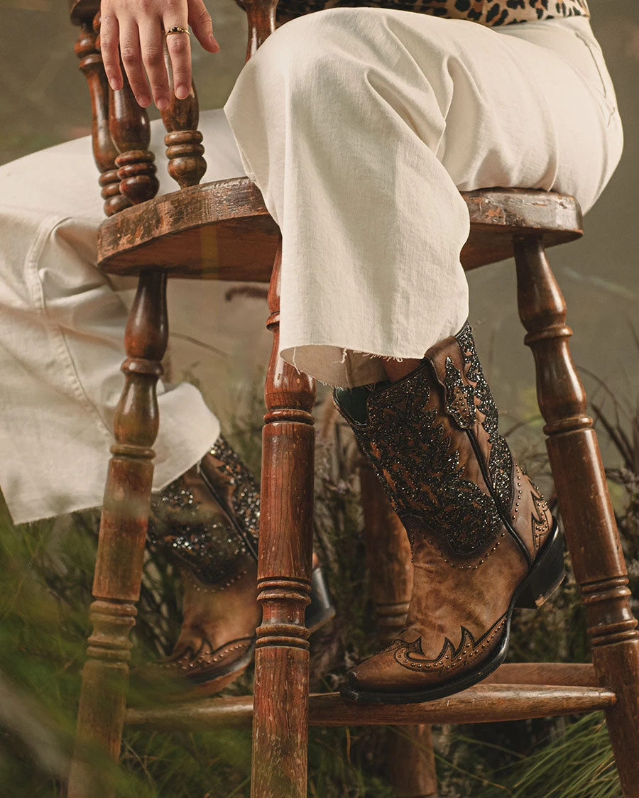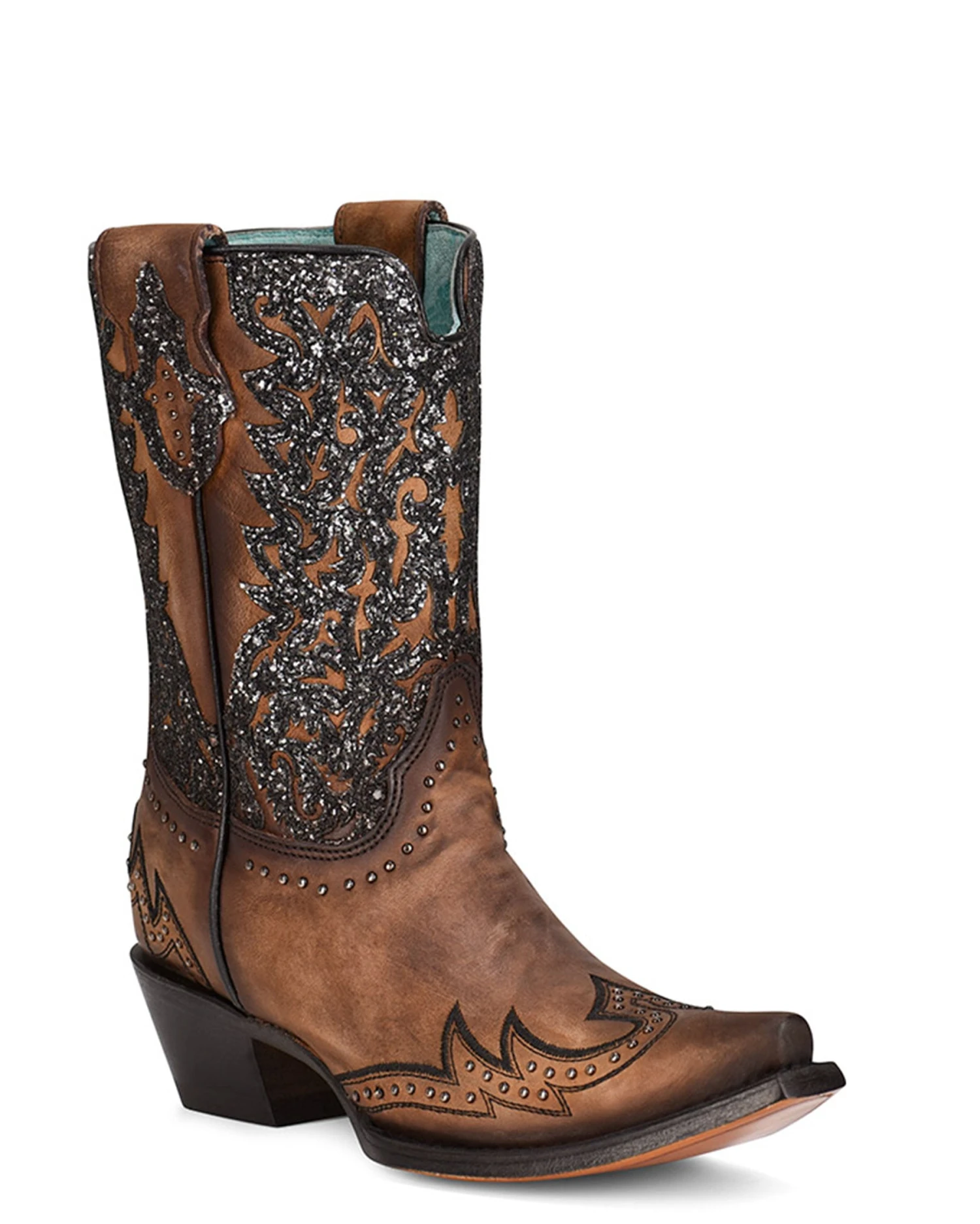 Introducing the Corral Women’s Glitter Overlay and Studs Ankle Boots – where fabulous fashion meets unbeatable comfort! These exquisite brown boots will be your go-to footwear for every occasion, turning heads and receiving compliments wherever you step. Expertly crafted with high-quality materials, our ankle boots boast a stunning black studded and glitter overlay, designed to sparkle and shimmer as you walk. The intricate black embroidery at the toe adds an elegant touch of sophistication, setting our boots apart from the competition. The short boot design not only offers unbeatable style but also promises convenience and easy wearability. Slip these on and off with ease, allowing you to transition seamlessly from day to night, and from work to play. If you’re ready to elevate your style and enchant everyone you meet, it’s time to grab a pair of Corral Women’s Glitter Overlay and Studs Ankle Boots. Trust us – these boots were definitely made for walking, and you deserve to do so in fierce, fashionable confidence!