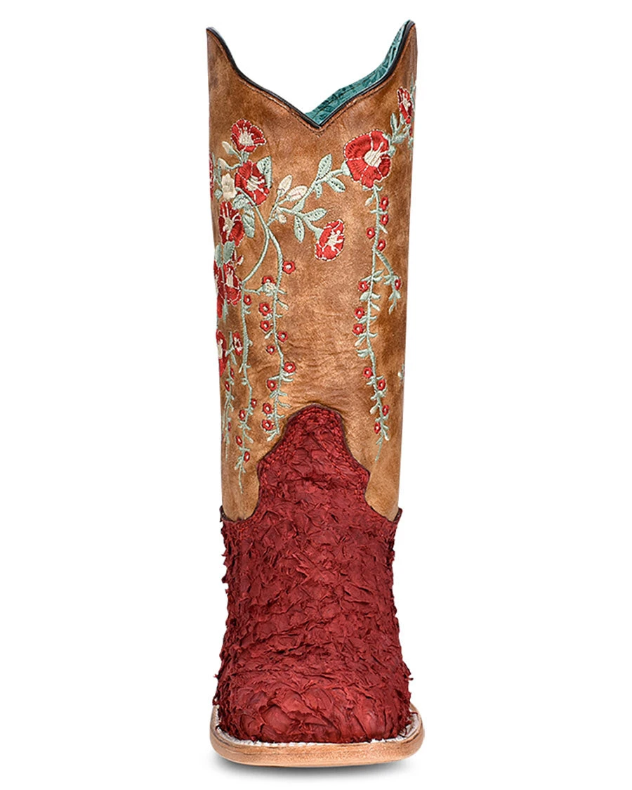 Introducing the Corral Women’s Rodeo Collection Fish Floral Embroidered Western Boots — a contemporary blend of fashion, comfort, and elegance, tailored exclusively for the modern cowgirl seeking a touch of extravagance. These unique boots blend premium craftsmanship, exotic materials, and a commitment to quality that sets them apart from the competition. Featuring an exotic, red Pirarucu fish, not only adds a distinct texture and style but also ensures long-lasting durability and resistance to the elements — a perfect choice for the contemporary woman passionate about nature and sustainability. The striking tan floral embroidered shaft embodies the spirit of the wild, bringing life and character to the boot while perfectly balancing the rich red fish. Each intricate detail is meticulously crafted to offer an unparalleled level of charm and beauty. The delicate green, red, and tan embroidery gracing the shaft adds an extra dose of luxury to this timeless design. Exuding confidence with its stylish square toe, the Corral Women’s Rodeo Collection Fish Floral Embroidered Western Boots make a bold statement while offering maximum comfort and support. This contemporary design combines the best of classic Western style and modern trends, ensuring that you will always stand out in any crowd.