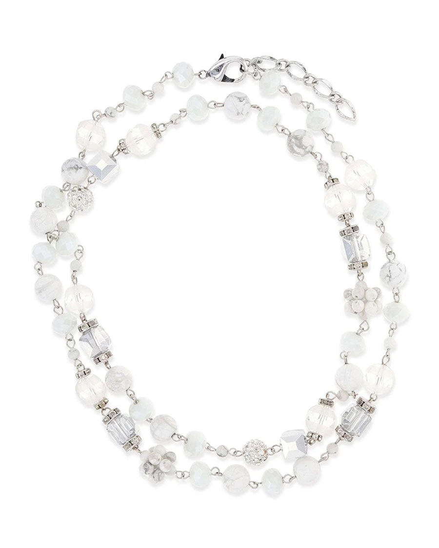 A long opera length single strand Attitude necklace, with a repeating design of small white faceted beads, large clear faceted beads in different shapes and white howlite colored bead clusters. Beads are interspersed with a round of clear stones set in bright silver. Necklace is versatile and can be worn as a single strand or looped twice around your neck. Necklace measure 38 inches in length.