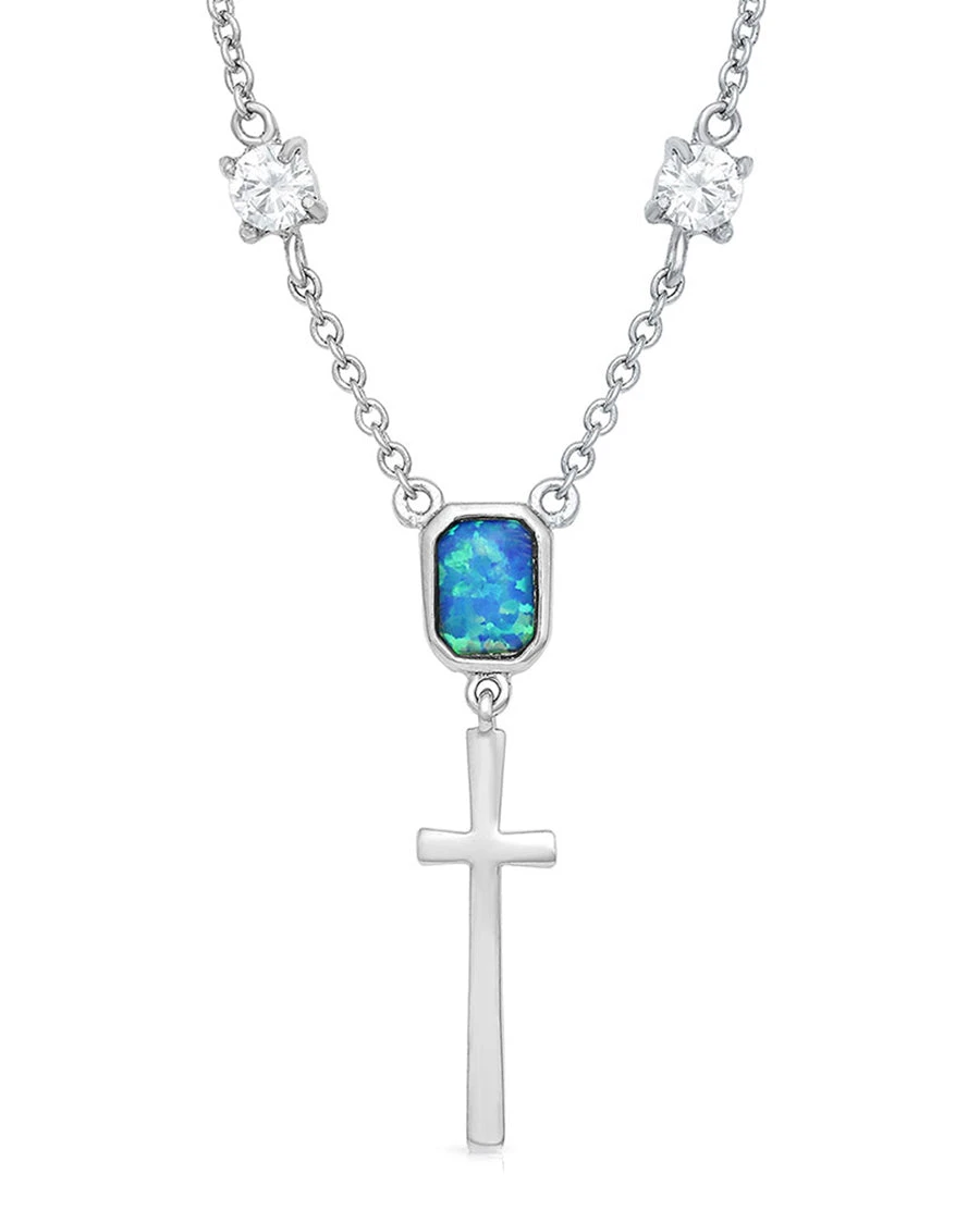 - This necklace has two round crystal studs, followed by a square opal gem. A suspended cross hangs from the bottom of the opal, all fastened by a silver finish.
