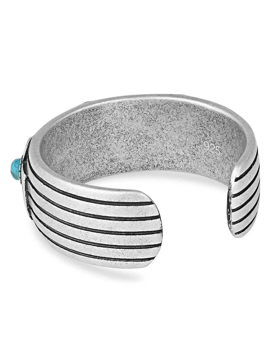 - A silver-toned ring with black lines wrap in a straight line. Thunderbird figures with turquoise centers are placed throughout.