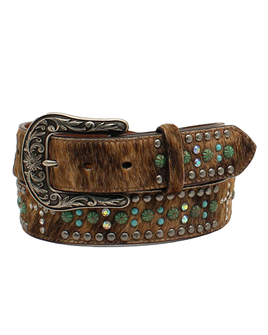 This stylish ladies Nocona belt by M&F Western Products is a great addition to your wardrobe. The leather strap has calf hair down the length of the belt. There are stones and crosses made of stone accenting the belt.