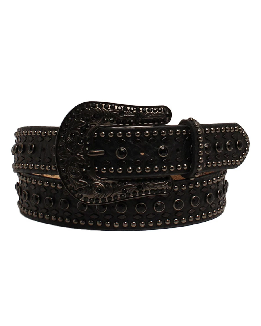 This trendy Nocona ladies belt by M&F Western Products® will get you noticed. It features black and metallic colored nailhead trim with black rhinestone accents and a black rhinestone buckle.