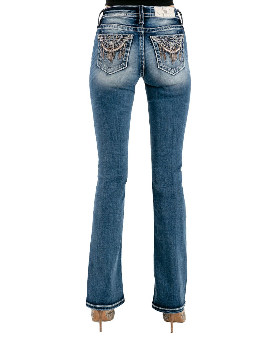 - Studded dream catcher embroidered back pocket, fading, contrast stitching and a 5-pocket design.