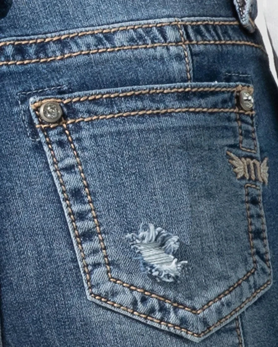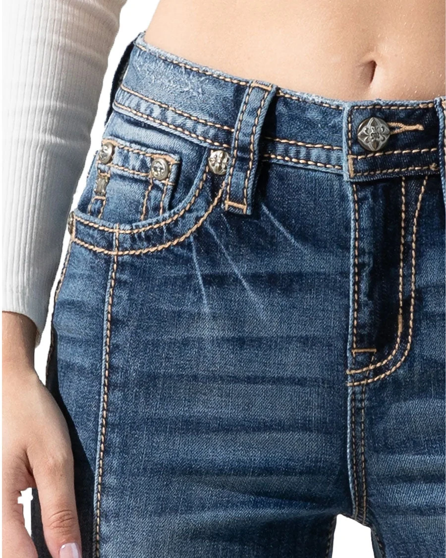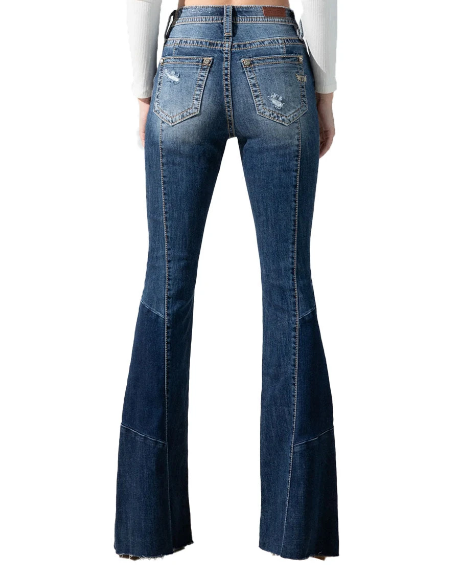 High rise medium blue flare jeans detailed with patchwork, destruction and a 5 pocket design and rhinestone rivets.