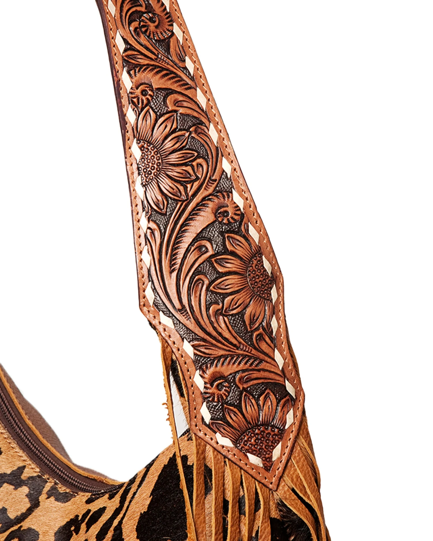 Introducing the Women’s Jaguar Tooled Shoulder Strap Hobo Bag! This gorgeous bag is handcrafted from genuine hair-on Brazilian cowhide and features beautiful floral tooling. The fringe accents add a touch of fun and sophistication, while the shoulder strap makes it easy to carry. Whether you’re running errands or heading out for a night on the town, this bag is sure to make a statement.