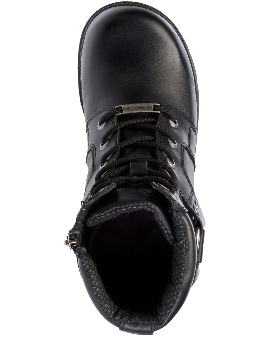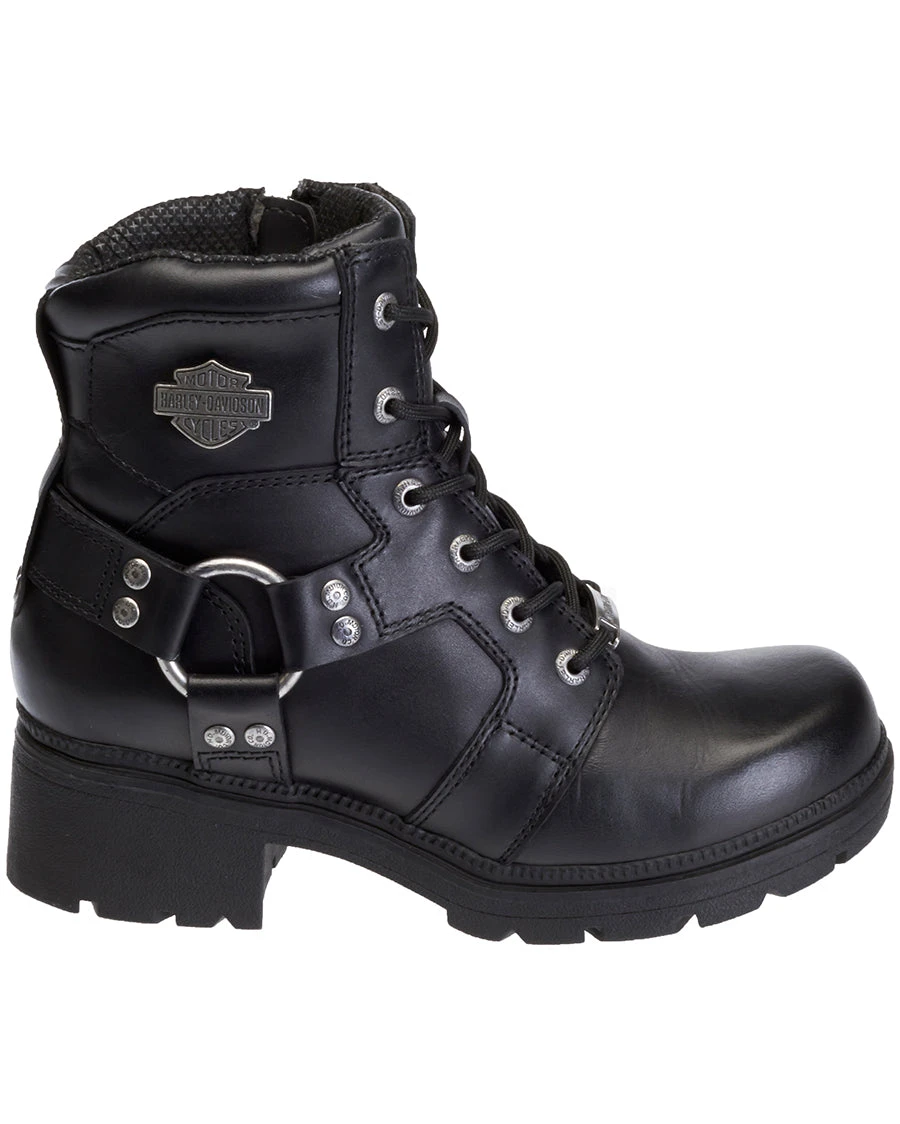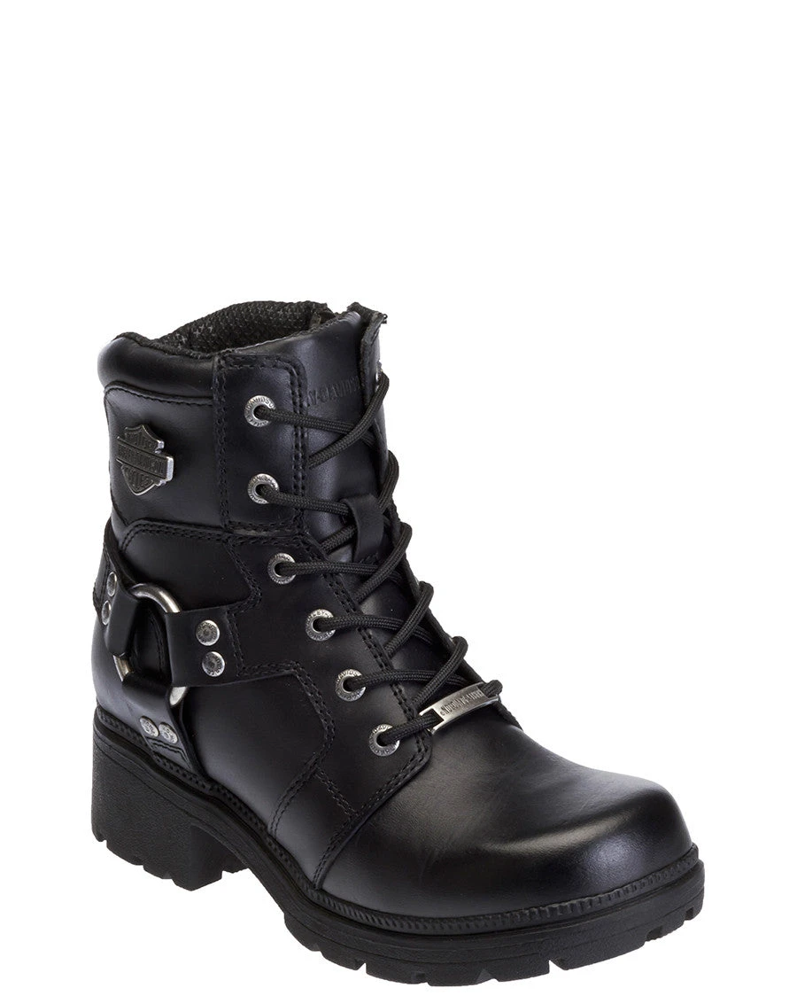 Fun, rugged and ready to work. These Harley Davidson lace-up boots have what it takes to show off your rugged style. The harness, chunky heels and round toe make these boots look tough. The full grain leather upper and cushion sock lining will keep your feet comfortable for hours of wear. An inside zipper makes for easy on and off. Pair these with jeans or shorts for a fun, casual look.
